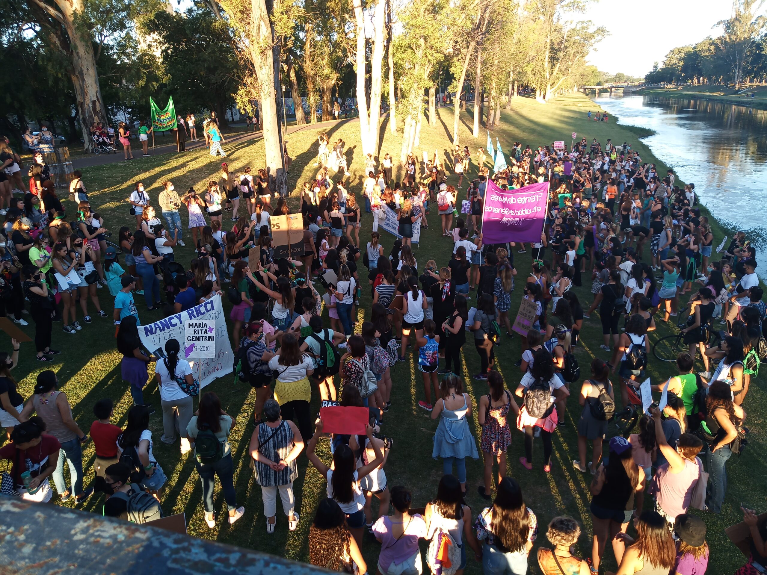Agitando los pañuelos verdes y violetas, las femeninas se expresaron en contra de la violencia de género durante la marcha que tuvo su punto culmine a la vera del Arroyo, en inmediaciones del Puente de las Mujeres.