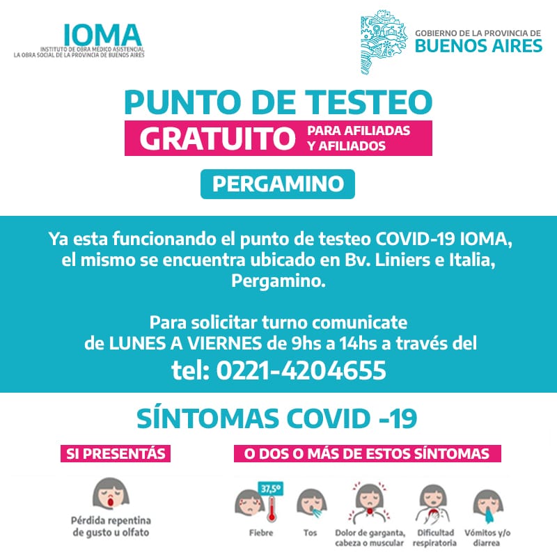 Días pasados, en Liniers e Italia, Ioma Pergamino abrió las puertas de un punto de testeo de coronavirus, totalmente gratuito, para los más de 16.500 afiliados con que cuenta el Instituto que nuclea a los empleados públicos de la provincia de Buenos Aires.