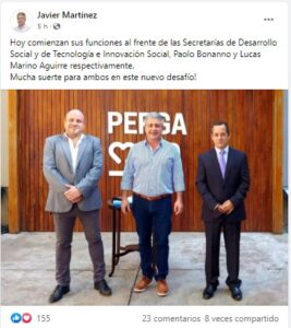 Al término de la jura el intendente de Pergamino, Javier Martínez, compartió la novedad en las redes sociales suyas: «Hoy comienzan sus funciones al frente de las Secretarías de Desarrollo Social y de Tecnología e Innovación Social, Paolo Bonanno y Lucas Marino Aguirre respectivamente. Mucha suerte para ambos en este nuevo desafío», expresó el jefe comunal pergaminense.