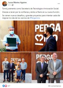 En sus redes sociales, Lucas Marino Aguirre posteó: «Tomé juramento como Secretario de Tecnología e Innovación Social. Gracias a Javier por la confianza y éxitos a Paolo en su nueva función. Se vienen nuevos desafíos y grandes proyectos para intentar cada día mejorar la vida de los vecinos de Pergamino».