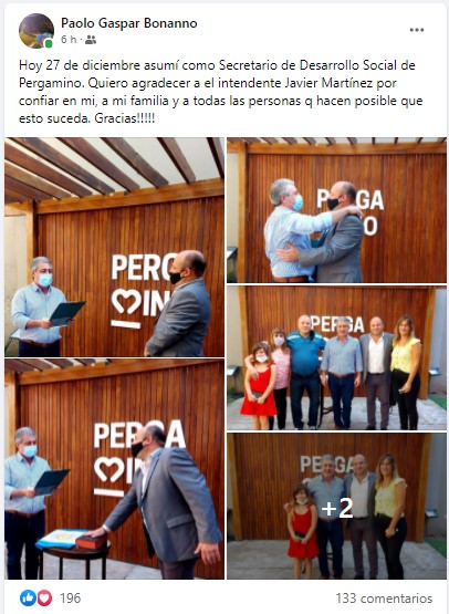 «Hoy 27 de diciembre asumí como Secretario de Desarrollo Social de Pergamino. Quiero agradecer a el intendente Javier Martínez por confiar en mi, a mi familia y a todas las personas q hacen posible que esto suceda. Gracias», compartió en las redes sociales Paolo Gaspar Bonanno.