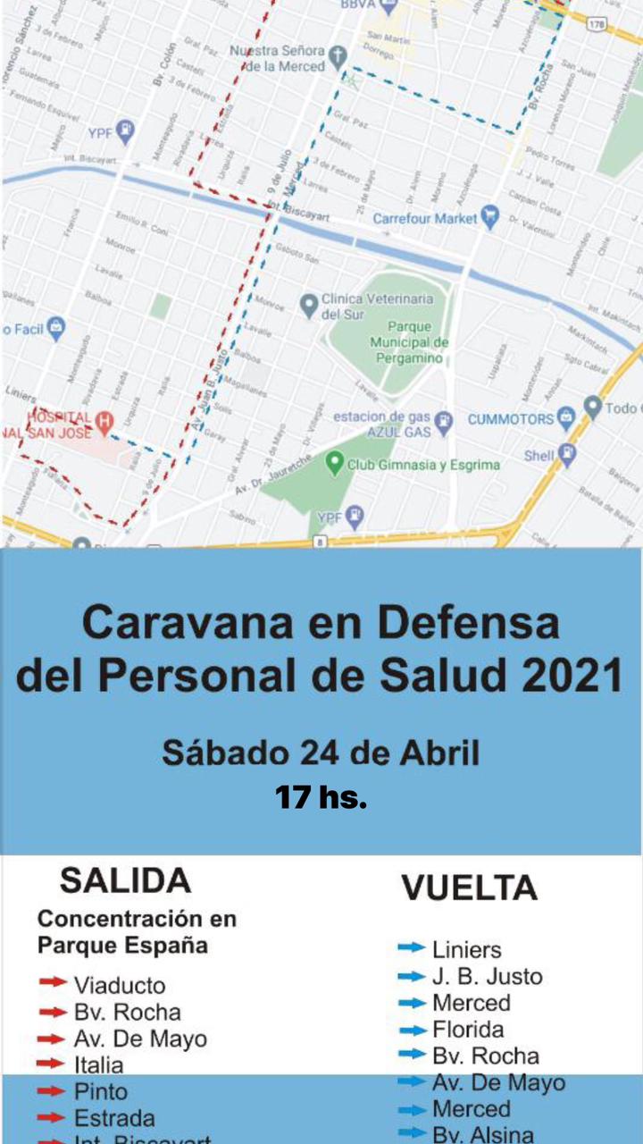 Hoy sábado a las 17 horas se realizará una caravana vehicular en apoyo de los profesionales de la salud. La misma partirá desde el Parque España (por calle España) y hará un recorrido por las calles de Pergamino. Se trata de una acción promovida desde la Asociación de Profesionales del Hospital San José, jefes de servicio del nosocomio y la Asociación Médica de Pergamino.