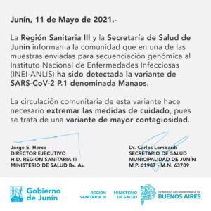 La Región Sanitaria III y la Secretaria de Salud del Gobierno de Junín informaron este martes que una muestra enviada al Instituto Nacionales e Enfermedades Infecciosas (INEI- ANLIS) para secuenciación genomica determinó la presencia de la variante SARS- COV 2 denominada Manaos.