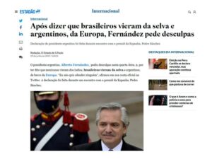 El medio Estadao, en cambio, se mostró muy crítico al sostener que se trató de un “discurso racista”: “Los brasileños vinieron de la selva y los argentinos, en barco desde Europa, dice Fernández en un discurso racista”. Pero luego cambió el foco del artículo cuando el mandatario argentino pidió disculpas por sus polémicos dichos.