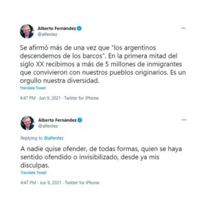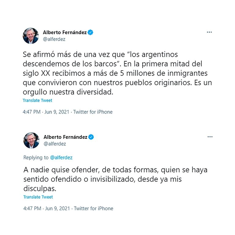 Tras sus dichos, que también provocaron malestar y críticas por parte de la oposición argentina, el jefe de Estado utilizó sus redes sociales para intentar explicar lo que quiso decir y pedir disculpas: “Se afirmó más de una vez que `los argentinos descendemos de los barcos´. En la primera mitad del siglo XX recibimos a más de 5 millones de inmigrantes que convivieron con nuestros pueblos originarios. Es un orgullo nuestra diversidad”. “A nadie quise ofender, de todas formas, quien se haya sentido ofendido o invisibilizado, desde ya mis disculpas”, completó.