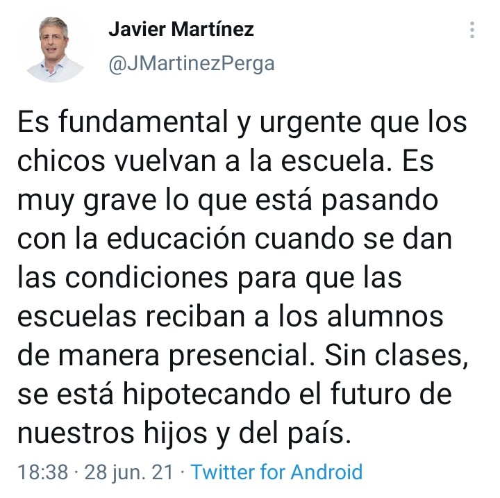 El lunes a la tarde desde su perfil de Twitter expresó su pensamiento en la importancia de la presencialidad escolar: “Es fundamental y urgente que los chicos vuelvan a la escuela. Es muy grave lo que está pasando con la educación cuando se dan las condiciones para que las escuelas reciban a los alumnos de manera presencial. Sin clases, se está hipotecando el futuro de nuestros hijos y del país».