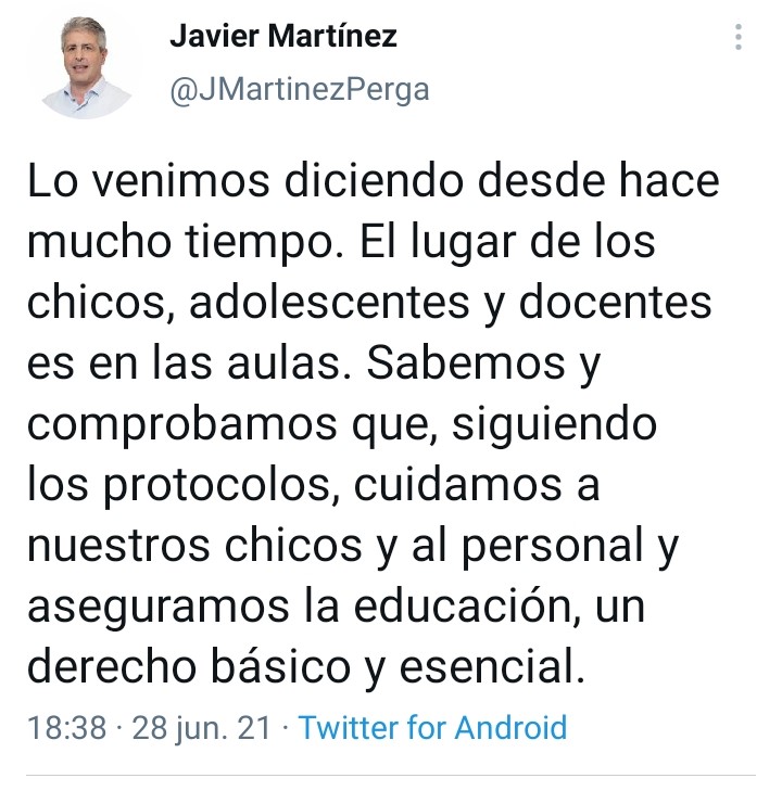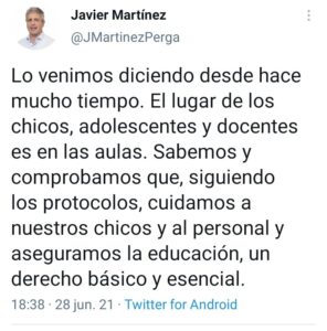 El hilo del tuit con hilo de Martínez continuó: «Lo venimos diciendo desde hace mucho tiempo. El lugar de los chicos, adolescentes y docentes es en las aulas. Sabemos y comprobamos que, siguiendo los protocolos, cuidamos a nuestros chicos y al personal y aseguramos la educación, un derecho básico y esencial”.