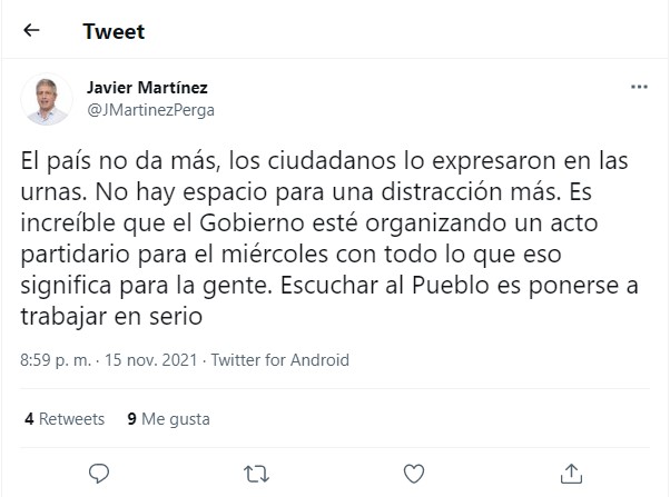 Desde su perfil @JMartinezPerga en la red de los 140 caracteres posteó: “El país no da más, los ciudadanos lo expresaron en las urnas. No hay espacio para una distracción más. Es increíble que el Gobierno esté organizando un acto partidario para el miércoles con todo lo que eso significa para la gente. Escuchar al Pueblo es ponerse a trabajar en serio”.