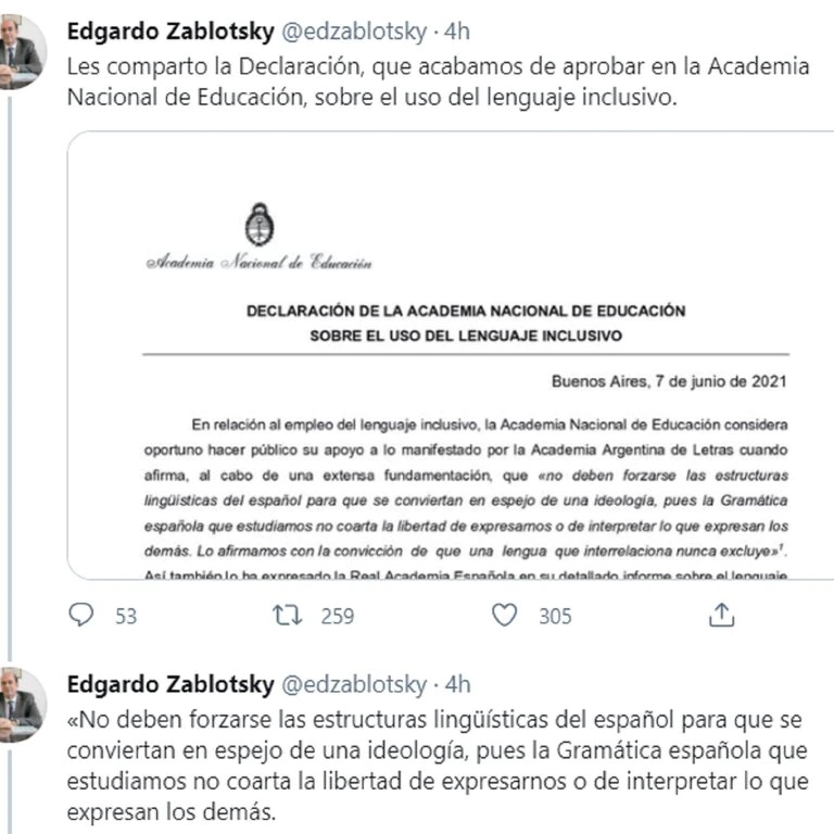 En el mismo sentido, desde la Academia Argentina de Letras explicaron que el llamado lenguaje “inclusivo” no es un lenguaje, sino “el espejo de una posición sociopolítica que desea imponer un grupo minoritario sin tener en cuenta el sistema gramatical del español”.