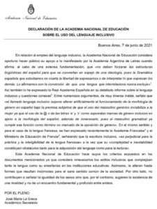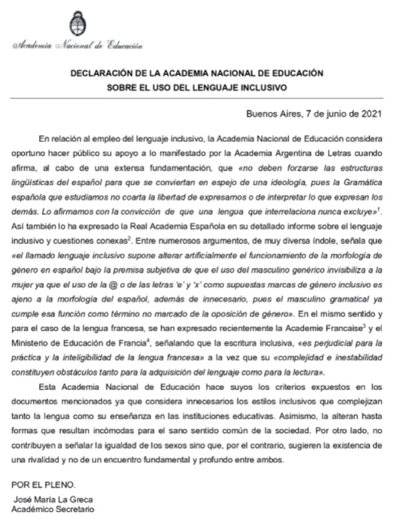 Con esta declaración, la Academia Nacional de Educación se sumó a las críticas que ya habían hecho públicas en su momento la Academia Nacional de Letras y la Real Academia Española.