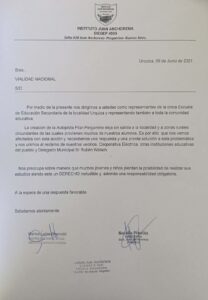 En la misiva destacan que son los representantes de la única Escuela de Educación Secundaria de la localidad de Urquiza y son la voz de toda la comunidad educativa preocupada por la posibilidad que: «muchos jóvenes y niños pierdan la posibilidad de realizar sus estudios siendo éste un derecho ineludible y, además, una responsabilidad obligatoria», tal como consignaron en la carta.
