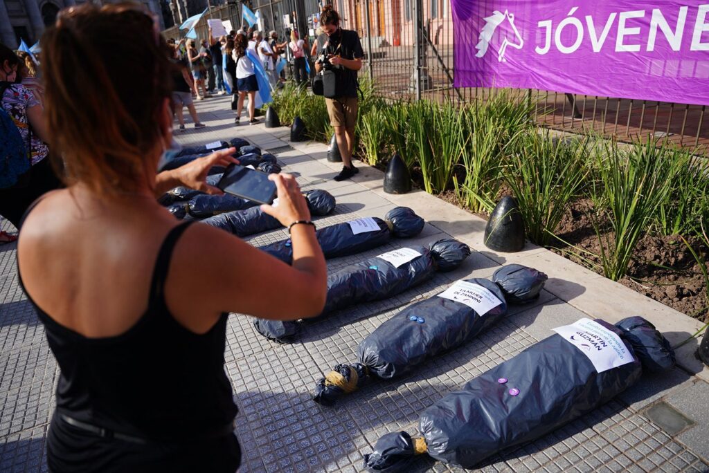 La organización Jóvenes Republicanos, que en su cuenta de Twitter se presenta como «la juventud de Unión Republicana», se adjudicó en esa red social la instalación de las bolsas simulando ser mortuorias frente a las rejas que rodean a la Casa de Gobierno, y afirmaron que se trató de «un pequeño recordatorio de todas las vidas que se perdieron» por la vacunación que cuestionaron.