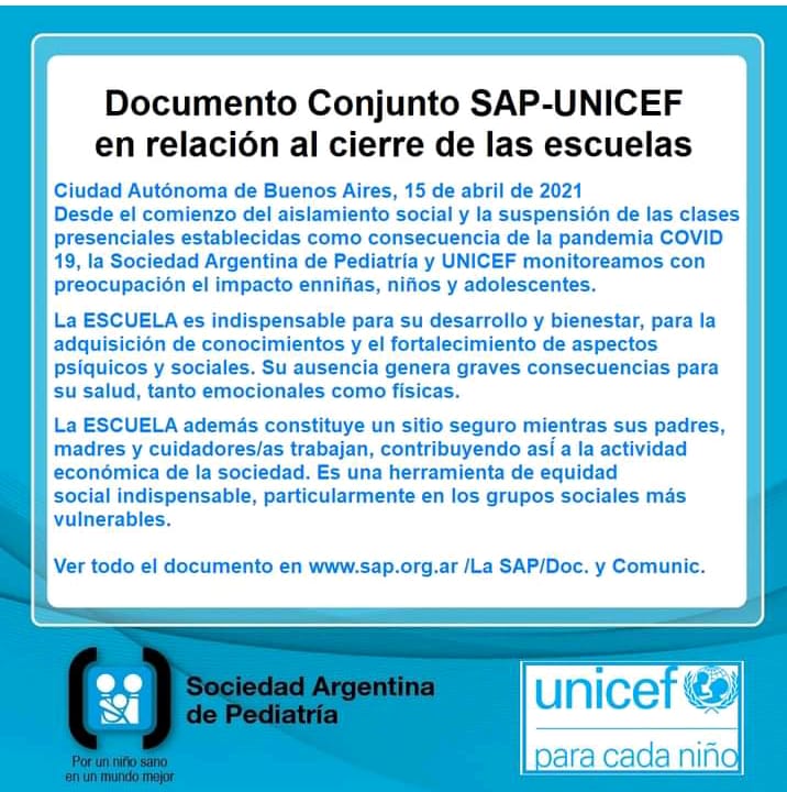 «Desde el comienzo del aislamiento social y la suspensión de las clases presenciales establecidas como consecuencia de la pandemia de COVID 19, la Sociedad Argentina de Pediatría y UNICEF monitoreamos con preocupación el impacto en niñas, niños y adolescentes» describe el documento y agrega: «La escuela es indispensable para su desarrollo y bienestar, para la adquisición de conocimientos y el fortalecimiento de aspectos psíquicos y sociales. Su ausencia genera graves consecuencias para su salud, tanto emocionales como físicas».