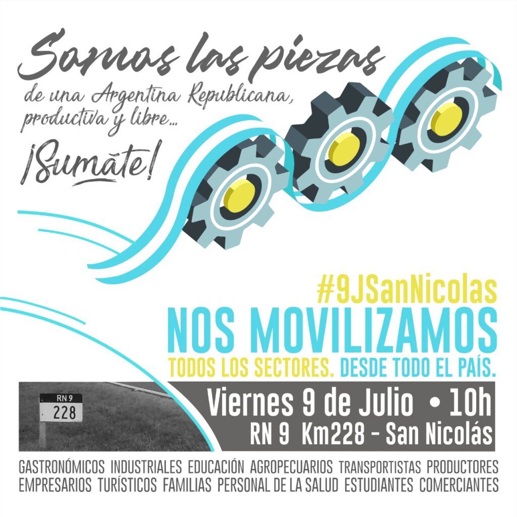 Los organizadores de la movida en Pergamino convocan a quienes quieran participar a reunirse previamente en el predio de la Sociedad Rural local. Así están convocando: «Estimados ciudadanos, los que deseen ir a la movilización convocada sobre la autopista RN9 km 228 a la altura de San Nicolás el día 9 de Julio, los invitamos a concentrar a partir de las 8:30 dentro del predio de la Sociedad Rural de Pergamino (cancha de Pato) para luego, a las 9:00, salir desde allí hasta el lugar indicado. Ruta 9 km 228 de San Nicolás. Los asistentes deben llevar banderas argentinas».