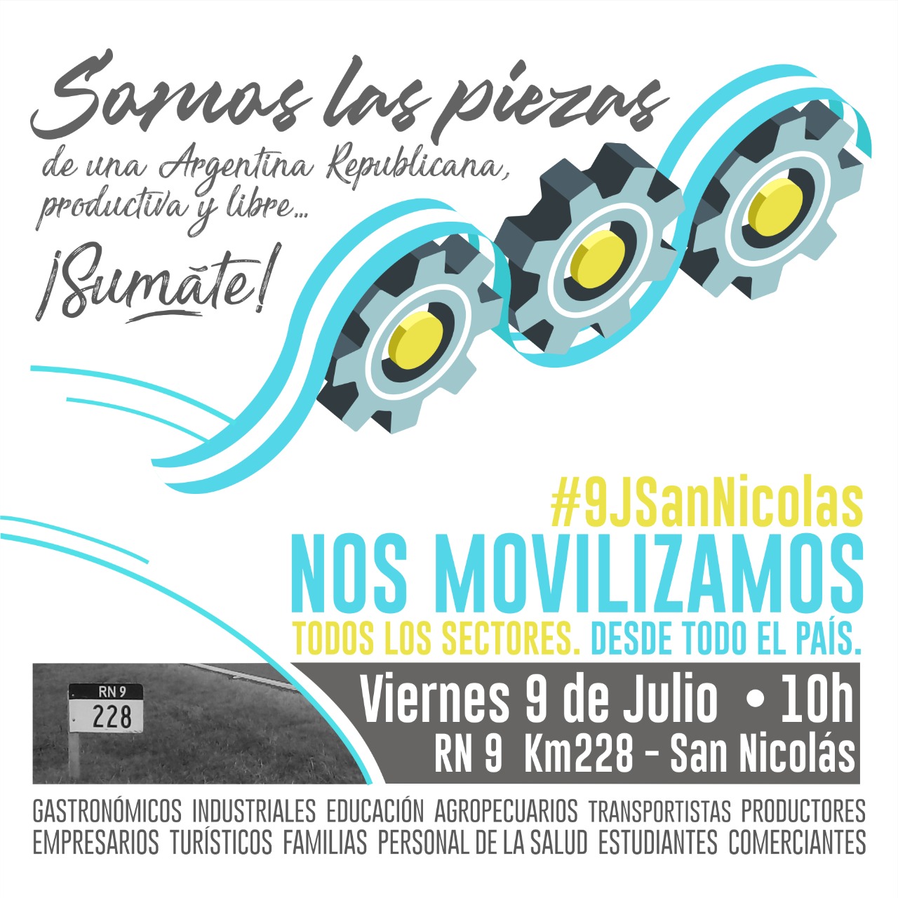 Bajo la consigna: «Somos las piezas de una Argentina Republicana, productiva y libre» marcharán desde distintos puntos del país emprendedores de los rubros: gastronomía; industriales; educación; agropecuarios; transportistas; productores; empresarios turísticos; familias; personal de la salud; estudiantes y comerciantes.