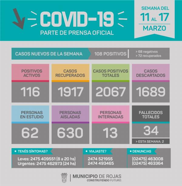 El municipio de Rojas reportó esta semana 108 nuevos contagios de Covid19, alcanzando un total de 116 casos activos vigentes y 34 decesos, tras el fallecimientos de dos personas de sexo masculino, uno de 68 y otro de 78 años de edad. 72 fueron los paciente con alta médica.