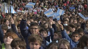 Antes de presentar a un hombre vestido como el creador de la bandera que tomaría juramento a los niños, Javkin recordó el momento en que el prócer nacional encargó en 1812 a un grupo de mujeres lideradas por María Catalina Echeverarría la confección de la insignia que los diferenciaría de los españoles.