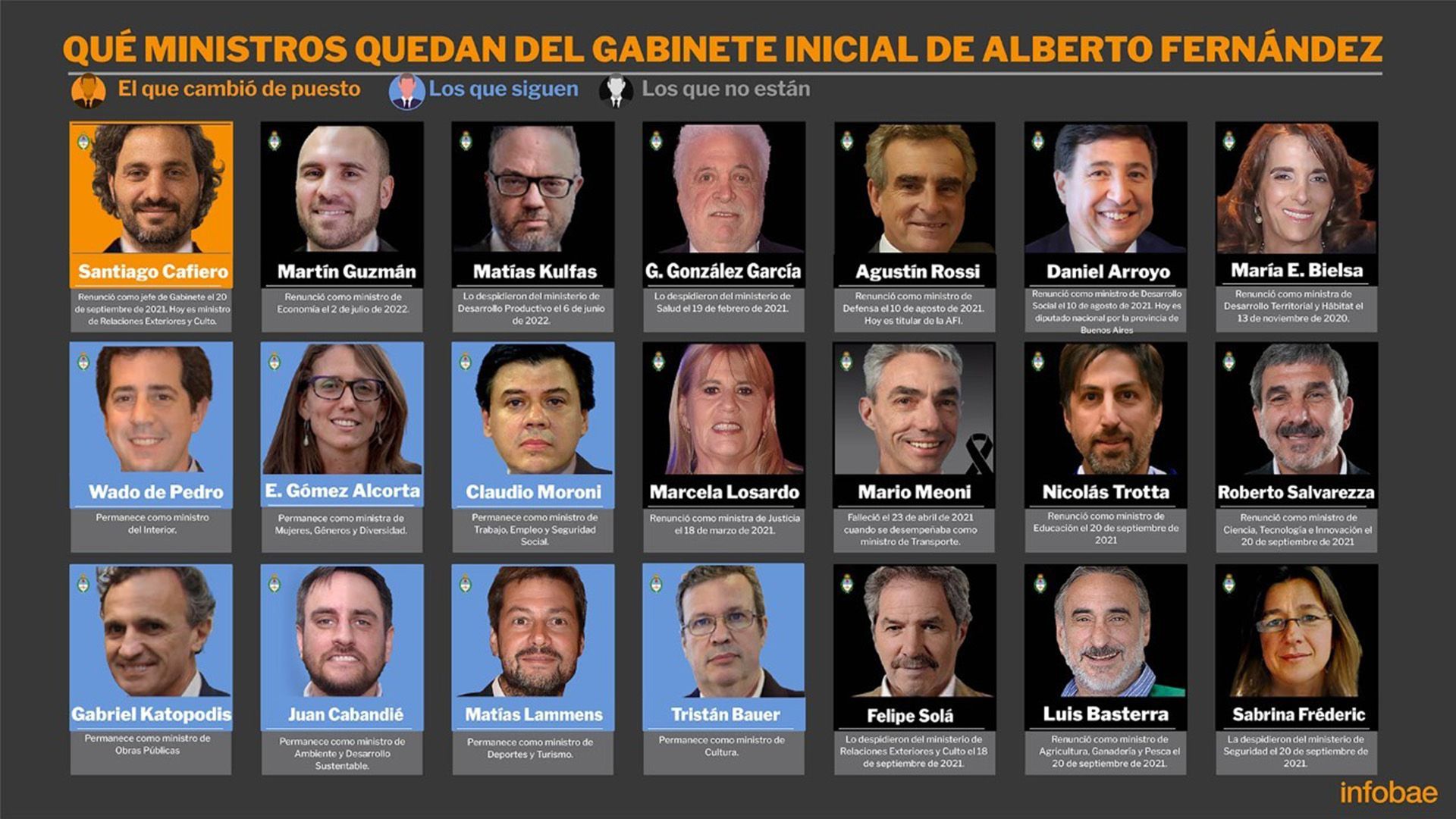 De ellos, 11 fueron despedidos o presentaron sus renuncias, 5 se movieron de un puesto jerárquico en una cartera a otro cargo dentro del Gobierno y uno falleció -el ministro de Transporte, Mario Meoni, en un accidente de tránsito- mientras estaba en funciones.
