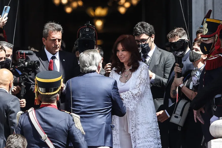 La vicepresidenta Cristina Kirchner recibió al al presidente Alberto Fernández junto al titular de la Cámara de Diputados, Sergio Massa. Lo saludó estrechándole ambas manos, mientras el jefe del Estado y Massa se saludaron con un beso.