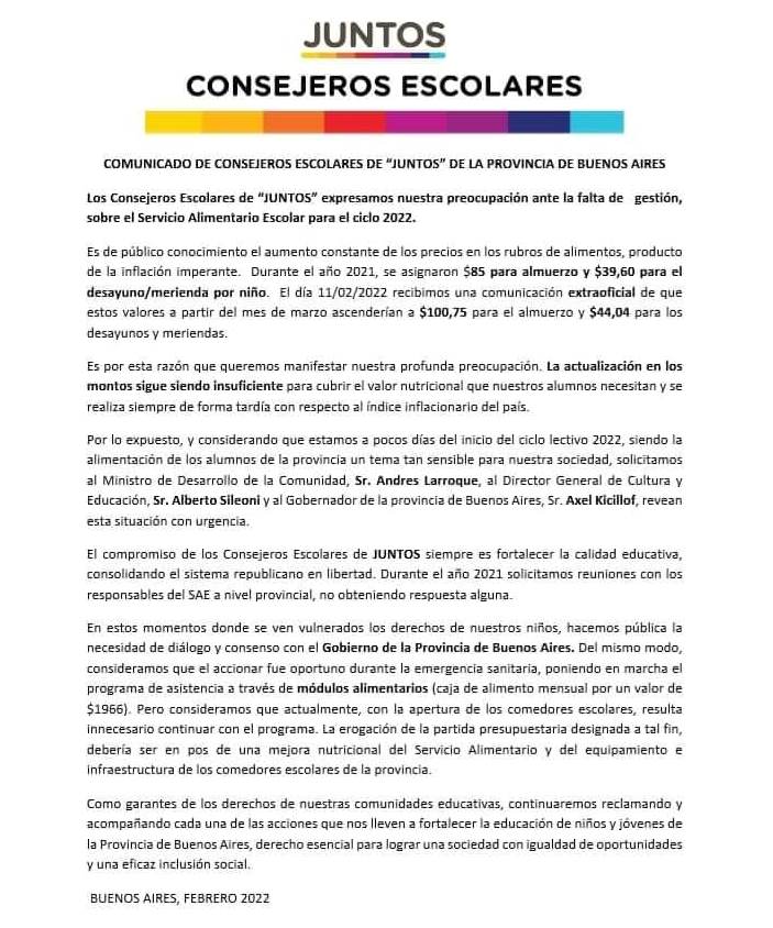 Consejeros escolares de Juntos de la provincia de Buenos Aires piden más fondos para el Servicio Alimentario Escolar en todos los distritos bonaerenses.