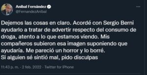 Fernández tuiteó este miércoles por la noche un meme en la que se muestra banderas de distintos países junto a la leyenda “El consumo de drogas mata” en referencias a políticas estatales. Sobre el final de esa imagen, aparece la bandera argentina junto a una frase distinta: “El que compró droga en las últimas 24 horas descártela porque es de la mala”, en alusión a una frase reciente de Sergio Berni.