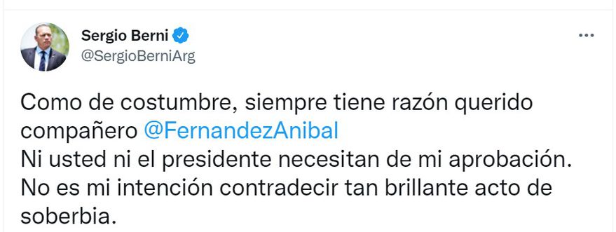 El funcionario de Axel Kicillof hizo silencio por unas horas, pero recogió el guante este lunes y embistió con dureza. “Como de costumbre, siempre tiene razón querido compañero Aníbal Fernández. Ni usted ni el presidente necesitan de mi aprobación. No es mi intención contradecir tan brillante acto de soberbia”, había lanzado.