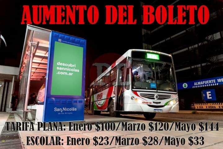 Los ediles de Juntos por el Cambio a través del Expediente Nº 17870/22 modificaron la Ordenanza Nº 7669 que fija los valores del pasaje en transporte público en el Partido de San Nicolás, aprobando un nuevo aumento que se aplicará en tres tramos (enero, marzo y mayo de 2023) y fijando los siguientes precios: