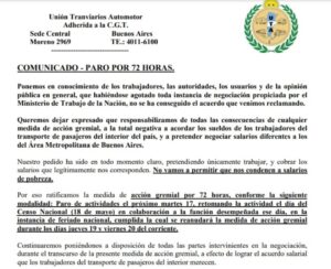 “Queremos dejar expresado que responsabilizamos de todas las consecuencias de cualquier medida de acción gremial, a la total negativa a acordar los sueldos de los trabajadores del transporte de pasajeros del interior del país, y a pretender negociar salarios diferentes a los del Área Metropolitana de Buenos Aires”, señala el documento que lleva la firma de Roberto Carlos Fernández, Secretario General Consejo Directivo Nacional de la UTA.