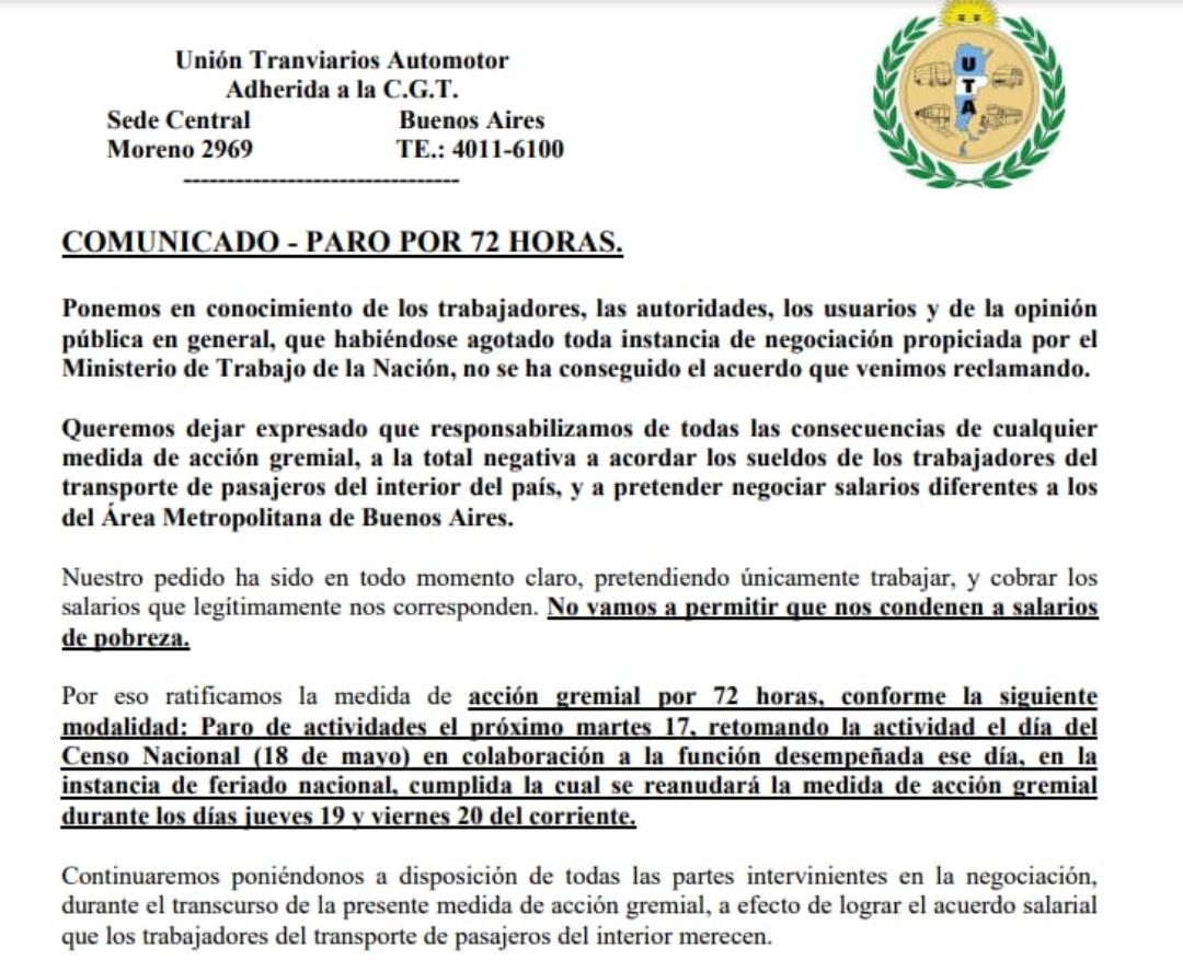 Sin lograr un acuerdo, y con la extensión de la conciliación obligatoria que finalizaba este lunes 16 de mayo, la UTA nacional difundió un comunicado en el que puso en conocimiento “de los trabajadores, las autoridades, los usuarios y de la opinión pública en general”, que iban a cumplir con la medida de fuerza anunciada la semana pasada desde el primer minuto de este martes 17 de mayo.