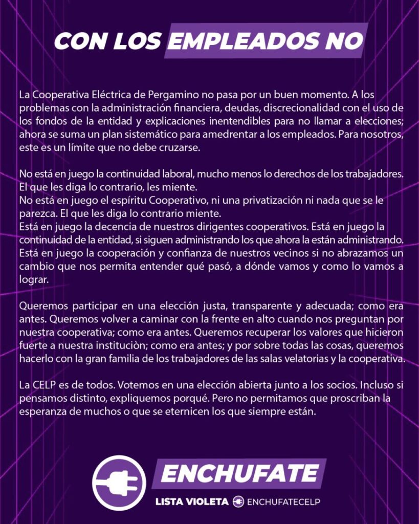 Los integrantes de la lista Enchufate, quienes aspiran a participar de las elecciones para conducir la administración de la Cooperativa Eléctrica de Pergamino han dado a conocer una solicitada para dar a conocer las expectativas sobre cuestiones muy sensibles para los empleados y asociados de la Celp.