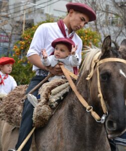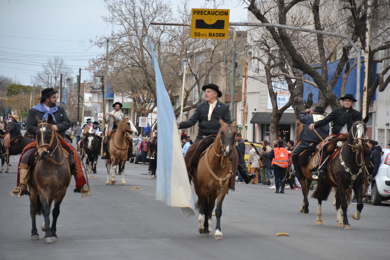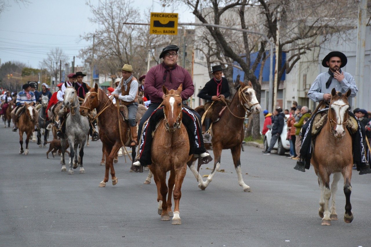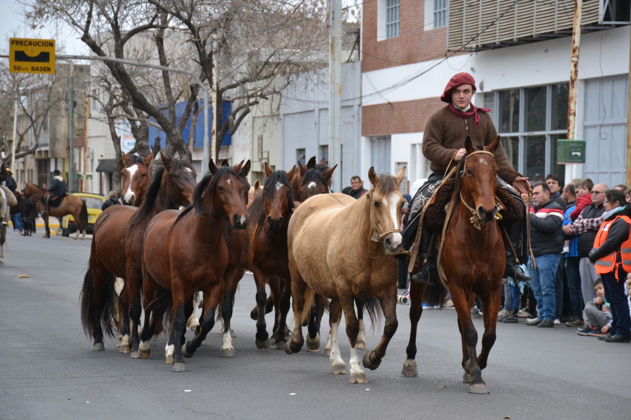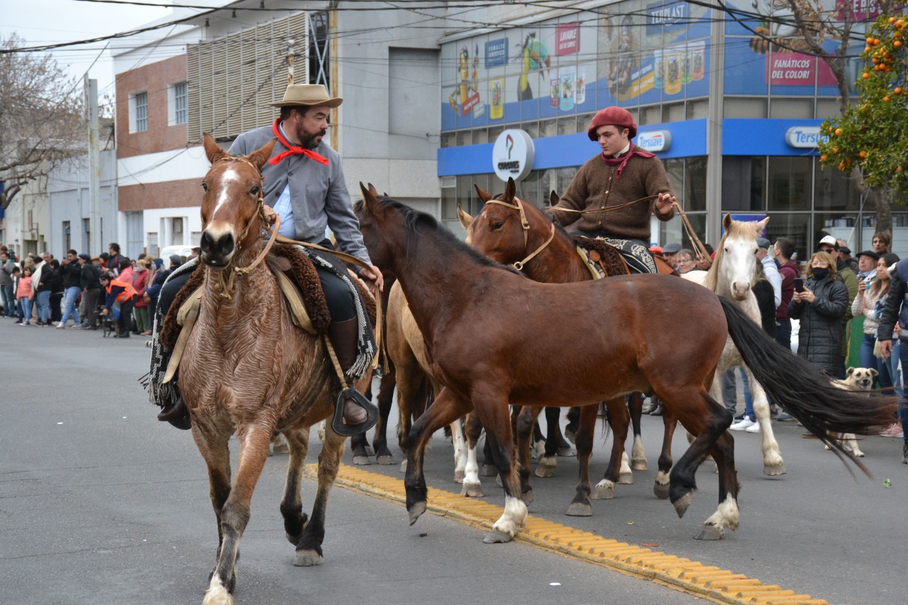Los jinetes del Fortín Pergamino desfilaron por avenida Alsina montados a caballos y trasladando tropillas; para la atracción de los presentes.