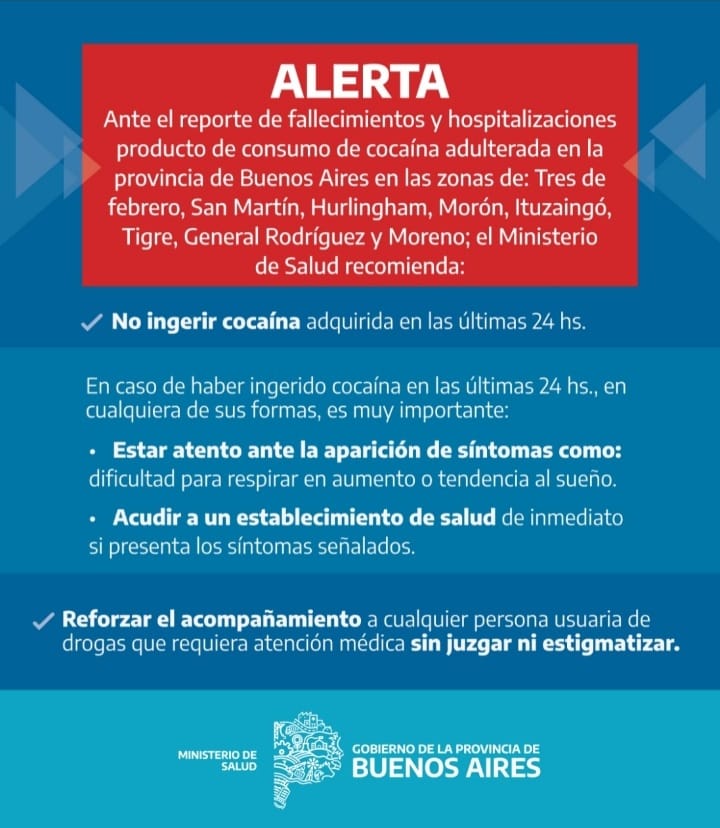 Una veintena de personas fallecieron y más de 70 permanecen internadas en grave estado tras consumir cocaína adulterada. Por este motivo, el Ministerio de Salud de la provincia de Buenos Aires emitió un alerta epidemiológico para los municipios de Hurlingham, San Martín, Tres de Febrero, Morón, Tigre, Ituzaingó y General Rodríguez.