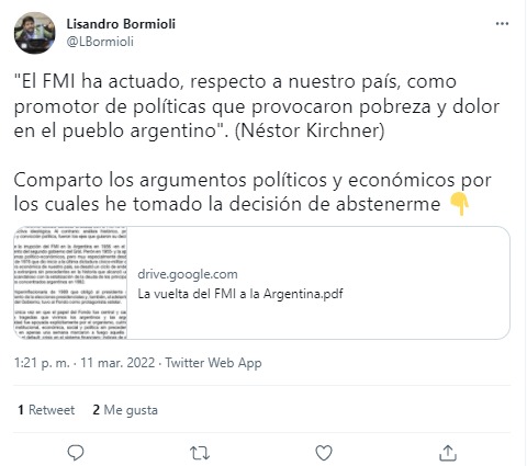 La abstención del diputado Lisandro Bormioli, en la votación de la Cámara baja del Congreso nacional por el acuerdo con el Fondo Monetario Internacional, colocó al legislador por Pergamino más cerca de la oposición dentro de la propia coalición de gobierno que a favor de la gestión nacional.