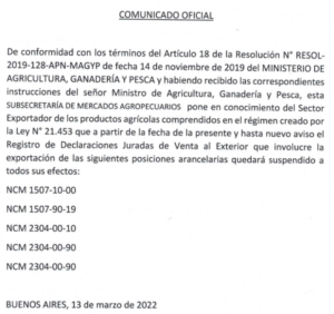 Comunicado completo de Agricultura por el cierre de exportaciones: