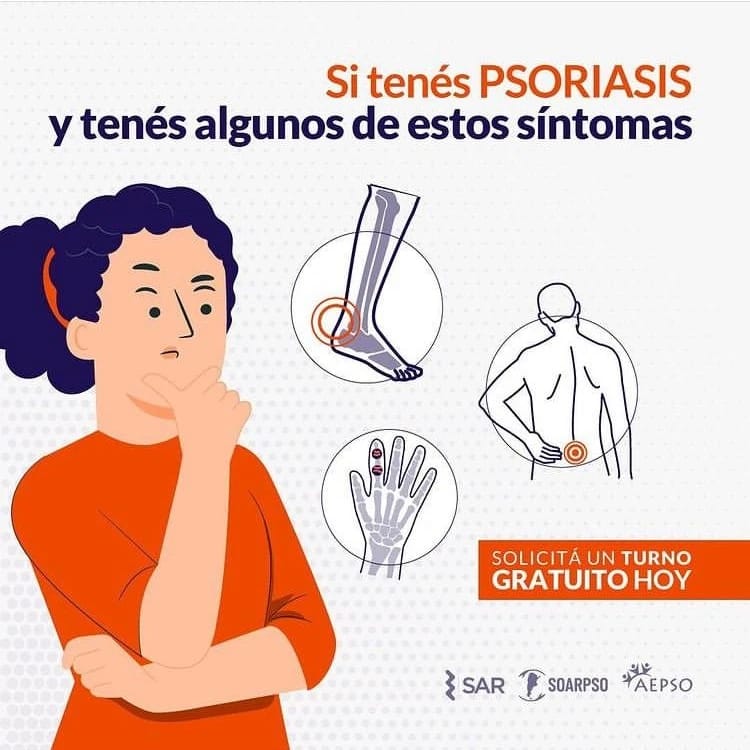 La Sociedad Argentina de Reumatología (SAR) y la Sociedad Argentina de Psoriasis (SOARPSO) junto a la Asociación para el Enfermo de Psoriasis y Artritis Psoriásica (AEPSO), llevarán a cabo una campaña de detección gratuita de enfermedad psoriásica con el objetivo de concientizar, prevenir y mejorar el diagnóstico temprano. Quienes deseen acceder a las consultas podrán solicitar el turno a través de la línea 0800 22 23776 ( o a través de la web: www.aepso.org.