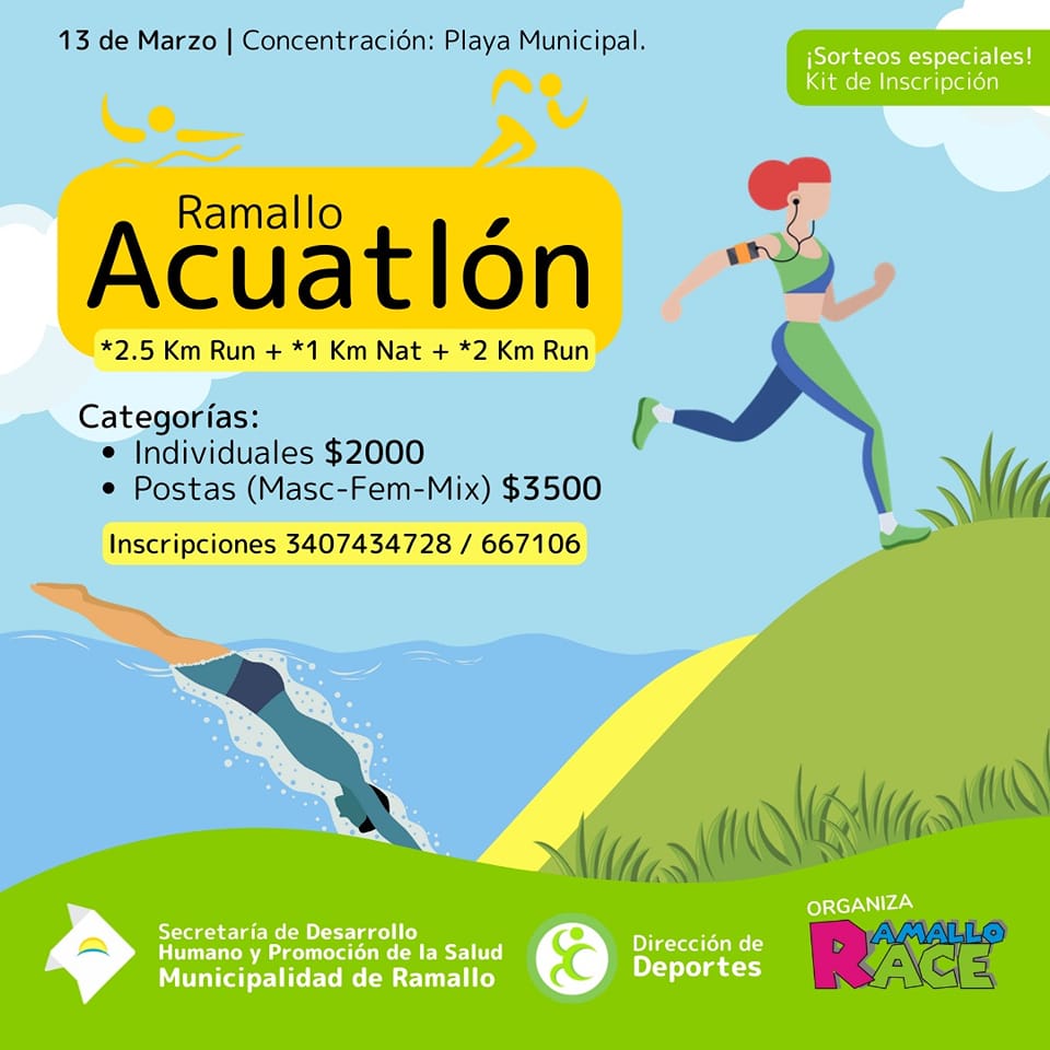 El próximo domingo 13 de marzo se realizará en Ramallo el Acuatlón que consta de 2.5 km. de running más un kilómetro de natación sumado a dos kilómetros de running. Habrá categorías individuales y postas; femeninas, masculinas y mixtas.