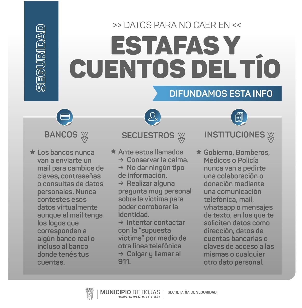 La Municipalidad de Rojas institucionalmente desde las redes sociales ha salido a advertir a la comunidad sobre las prevenciones que deben tener ante casos de estafas y cuento del tío.