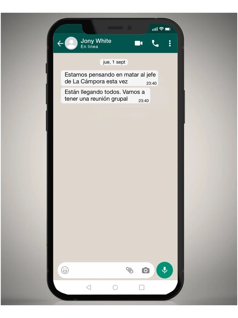 Se trata de una serie de chats que se encontraron en el teléfono celular de Carrizo y en los cuales el sospechoso le reconoce a una persona, a la cual tiene agendada con el nombre de “Jony white”, que estaba “pensando en matar al jefe de La Cámpora esta vez”.