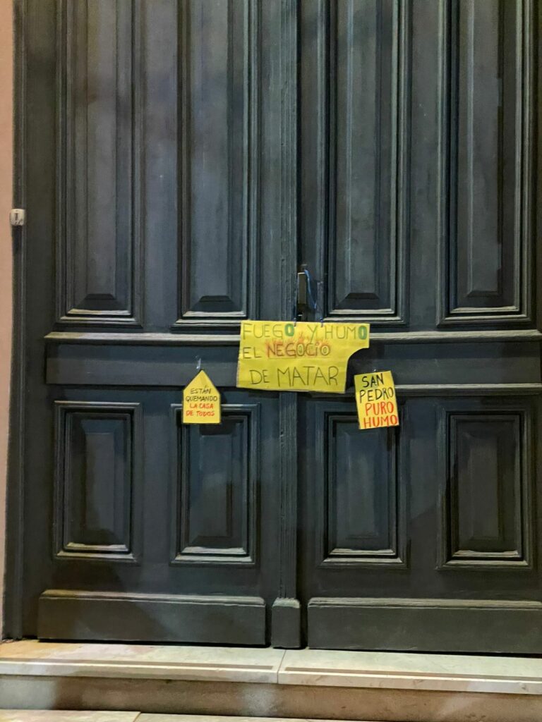 «Están quemando la casa de todos. San Pedro puro humo», rezan los carteles que los vecinos acercaron al edificio en un día en el que el ecocidio quedó a la vista de todos cuando el humo llegó a la Ciudad de Buenos Aires y a la zona norte y oeste del Conurbano.