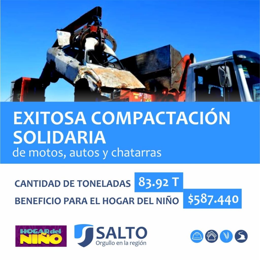 De acuerdo a la información oficial del Municipio de Salto terminaron compactadas ochenta y tres toneladas que generaron 587.440 pesos de ganancias en beneficio del centro de asistencia a niños del distrito bonaerense.
