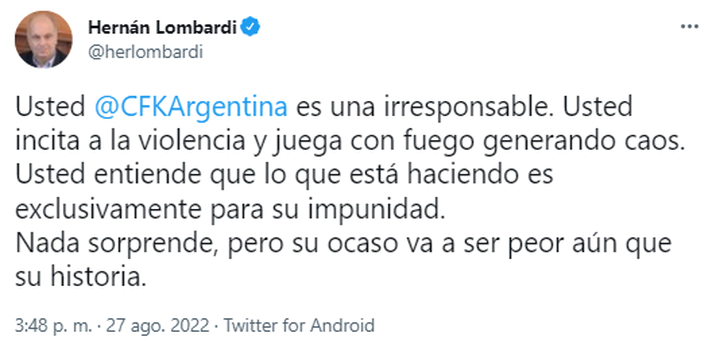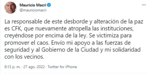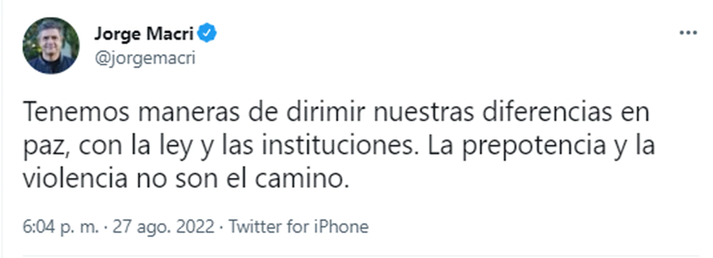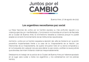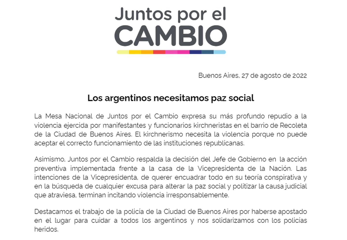“Los argentinos necesitamos paz social” se titula la carta compartida por el principal partido político de la oposición que “repudia la violencia ejercida por los manifestantes y funcionarios kirchneristas” y respalda el accionar del Jefe de Gobierno de la Ciudad de Buenos Aires, Horacio Rodríguez Larreta.