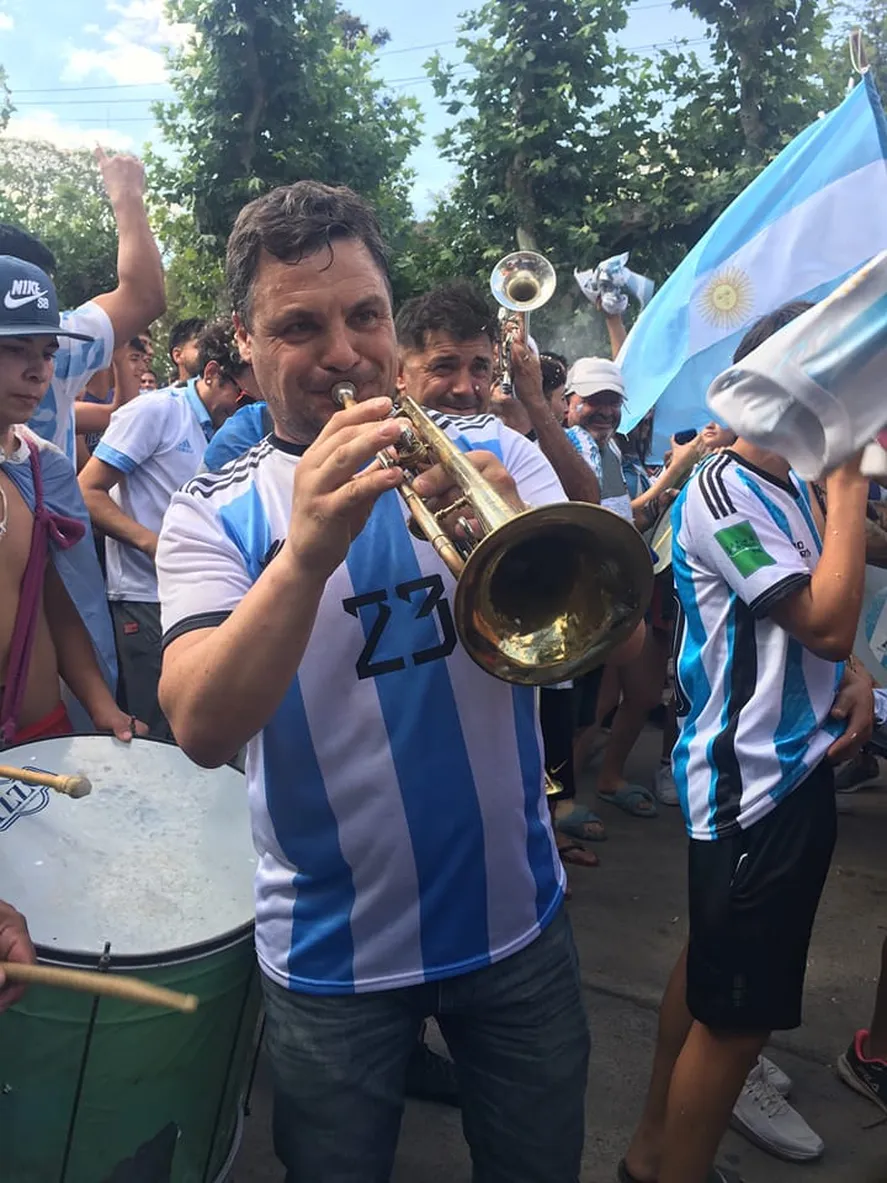 Con trompeta en mano, Miguel Gesualdi marcó el ritmo de los cánticos y celebraciones de los cientos de vecinos que salieron a celebrar a las calles de su localidad.