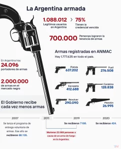 De acuerdo a las cifras entregadas por la ANMAC, en base a documentación del Banco Nacional Informatizado de Datos (BNID), en la Argentina hay 1.088.012 “legítimos usuarios” de armas de fuego.