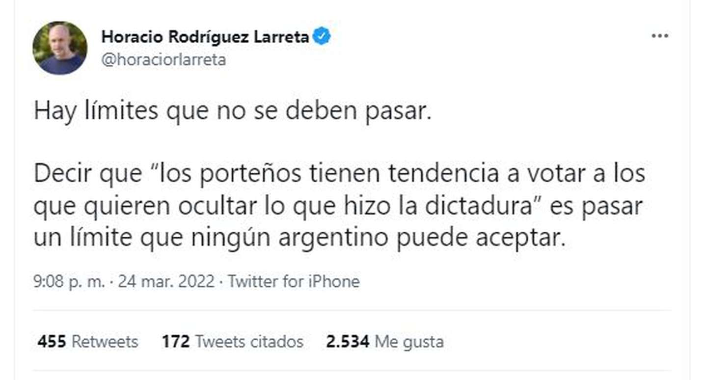 Al comenzar el hilo de tuits dijo que “hay límites que no se deben pasar. Decir que ‘los porteños tienen tendencia a votar a los que quieren ocultar lo que hizo la dictadura’ es pasar un límite que ningún argentino puede aceptar. Y mucho menos un día como hoy, al cumplirse 46 años de una de las heridas más profundas y dolorosas de nuestra historia”.