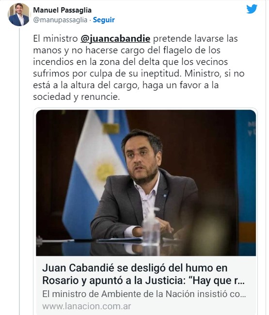 Al respecto, el intendente de San Nicolás apuntó contra la cartera que conduce Juan Cabandié. En ese sentido, a través de sus redes sociales Passaglia expresó que «El ministro @juancabandie pretende lavarse las manos y no hacerse cargo del flagelo de los incendios en la zona del delta que los vecinos sufrimos por culpa de su ineptitud. Ministro, si no está a la altura del cargo, haga un favor a la sociedad y renuncie».