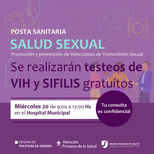 Este miércoles 20 de abril en Salto desde la Municipalidad desarrollarán una acción con la Posta de Salud Sexual realizando testeos gratuitos de VIH y Sífilis.