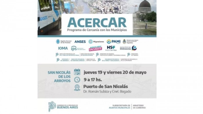 En San Nicolás los días jueves 19 y viernes 20 de mayo de 9 a 17hs, en el Puerto de San Nicolás (Román Subiza y Bogado) se desarrollará “Acercar”, el programa de cercanía con los municipios.