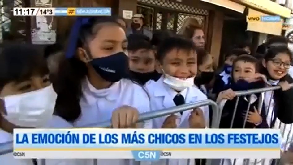 Mientras en el videograph se leía “La emoción de los más chicos en los festejos”, la cronista decidió hacerles una pregunta: “¿Qué le van a decir al Presidente cuando lo vean pasar?”.