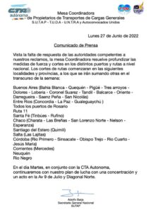 El Sindicato Único de Trabajadores de Administraciones Portuarias (SUTAP), que se encuentra nucleado en la CTA Autónoma, comunicó, que “ante la falta de respuestas de las autoridades competentes”, continuarán con la realización de bloqueos de rutas y puertos en diferentes puntos del país, para protestar por la escasez del combustible. Por ejemplo, frente al Obelisco, en la Avenida 9 de Julio y Diagonal Norte, de la Ciudad de Buenos Aires, realizarán este martes un acto y movilización.