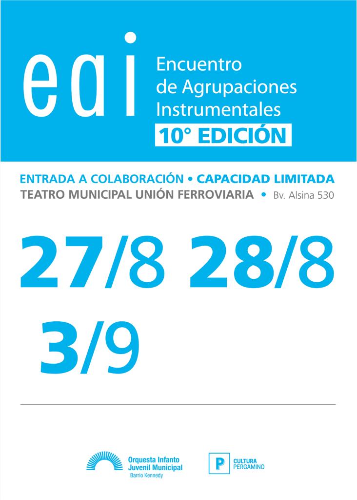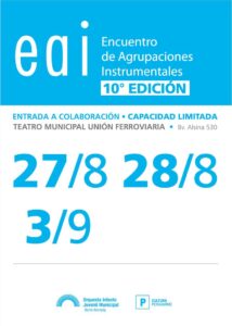 El décimo Encuentro de Agrupaciones Instrumentales tendrá lugar sábado 27 y domingo 28 de agosto y el sábado 3 de septiembre, en el Teatro Municipal Unión Ferroviaria (Alsina 530) a las 20:30 y a las 19:30 horas respectivamente. La entrada será como siempre a colaboración y lo recaudado será destinado a la compra de instrumentos e insumos para la Orquesta de Barrio Kennedy.